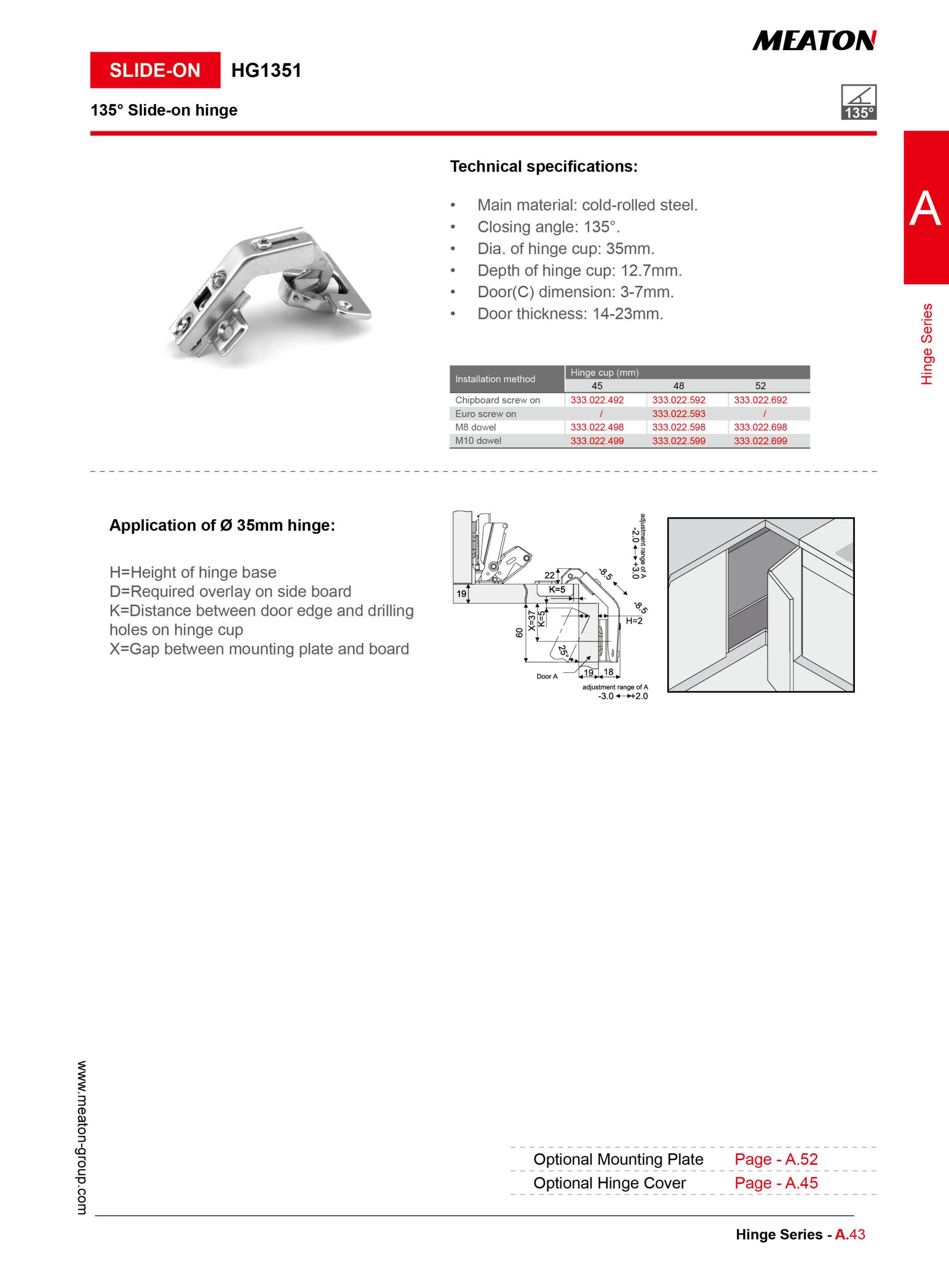 Diámetro de cazoleta de 35 mm. Ángulo de apertura de 135°.