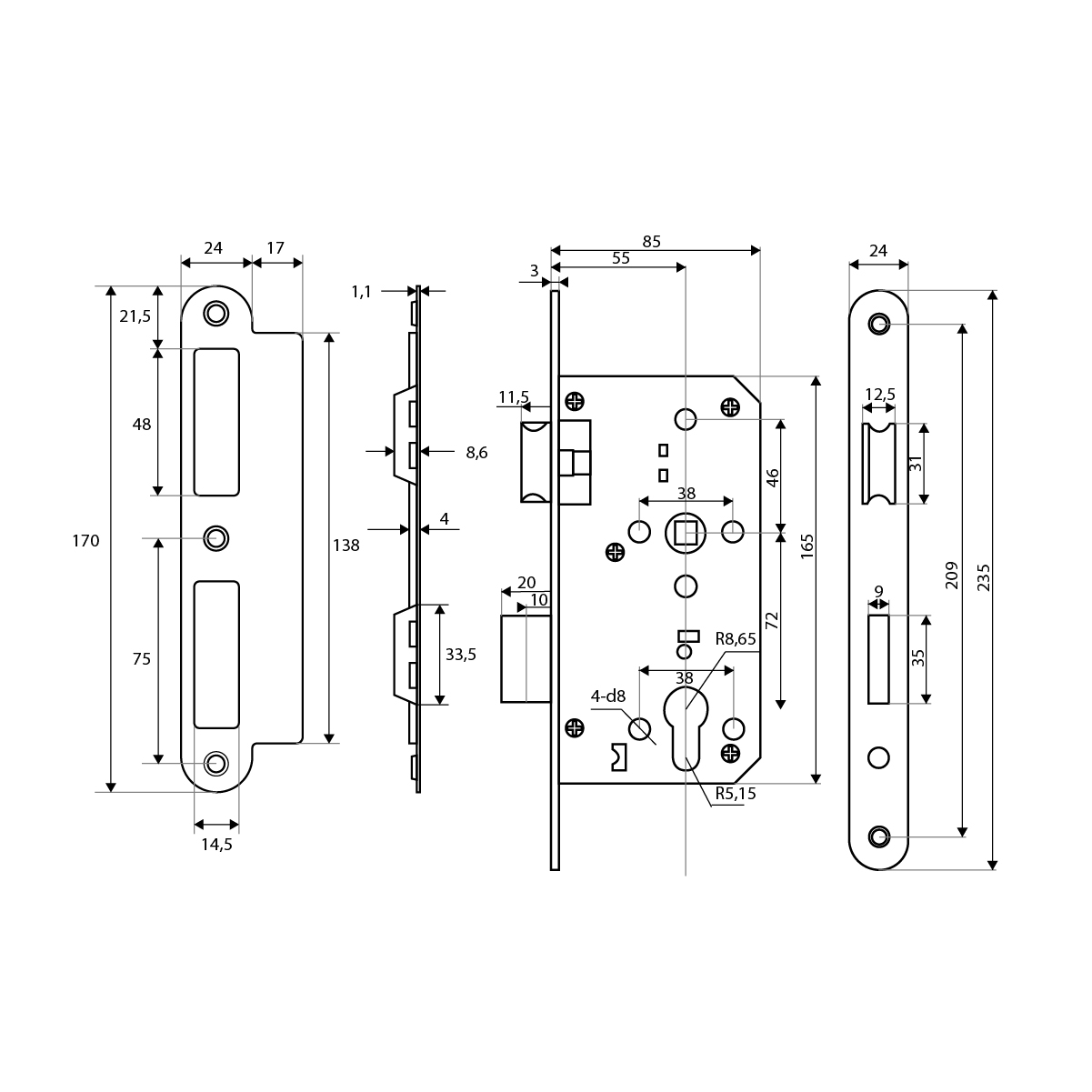 Cerradura EURO con frente de acero inoxidable. Distancia entre ejes de 72 mm. 55 mm. de extremo de cerradura a centro de ejes Caja de 81×165 mm. Frente de 235 mm. de largo. Incluye recibidor y tornillos Cerrojo de 2 vueltas. Garantia de 60000 ciclos.