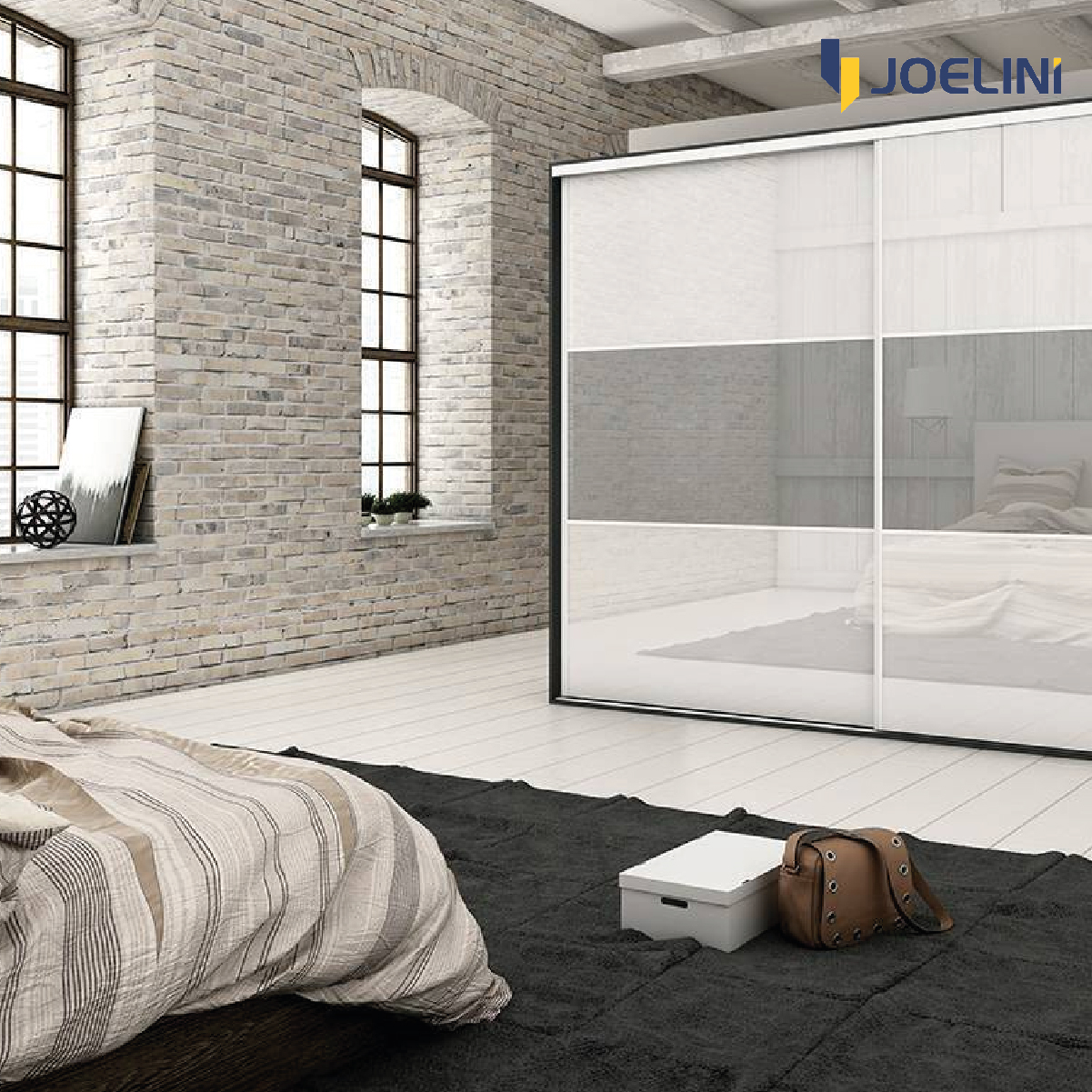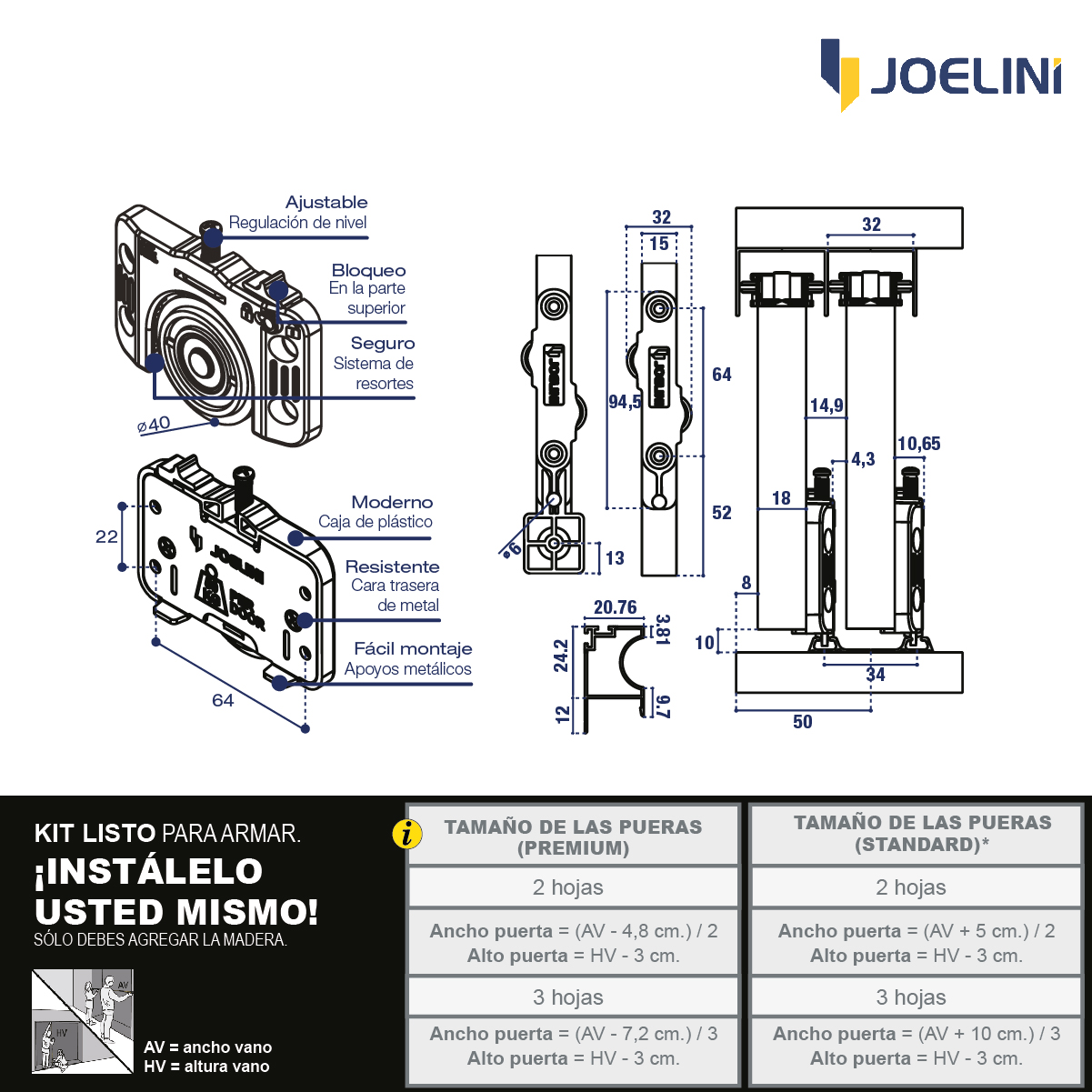 Sistema corredizo para puertas de closet, con guías superiores y topes. De instalación sobrepuesta, con regulación, bloqueo y resortes anti-descarrilamiento. Para puertas de 50 kg.