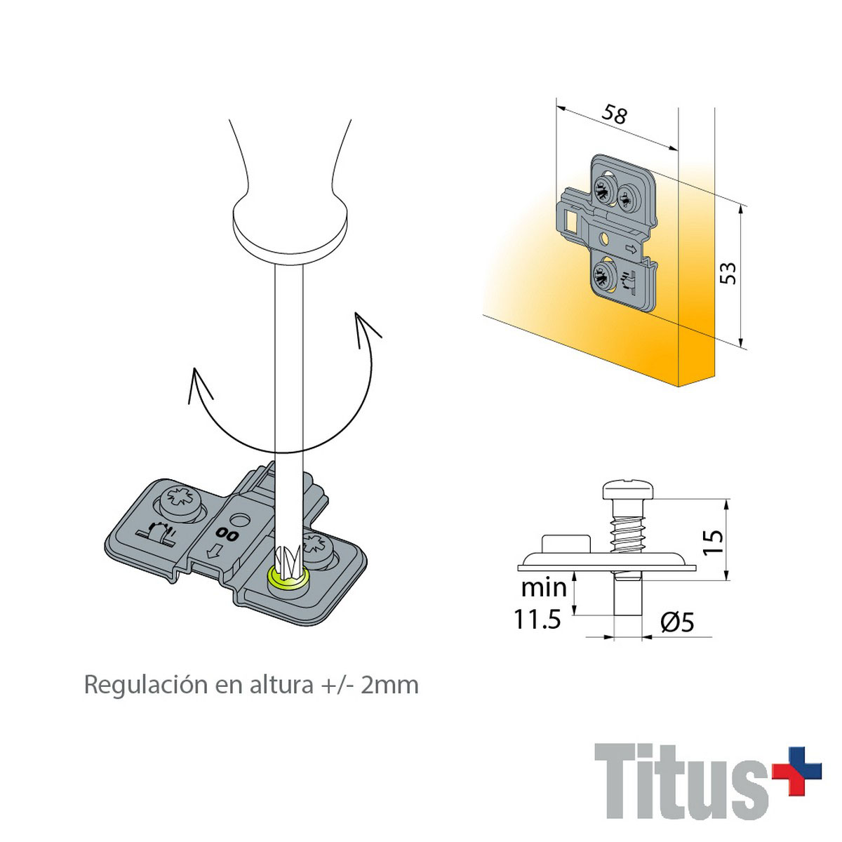 Base ajustable. Perminte regulación tridimensional. Compatible con todas las bisagras TITUS tipo S. Tornillos Euro incluídos.